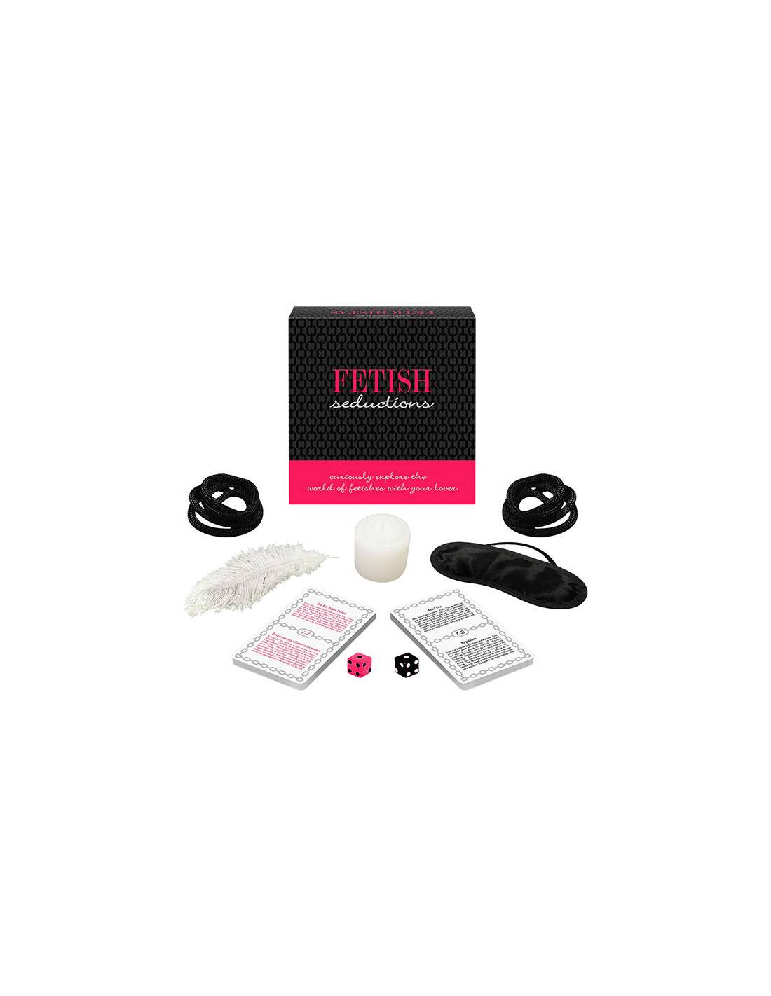 Fetish Seduction incluye 36 cartas (en Inglés, español, alemán y francés), cuerdas, vendas para los ojos, plumas estimulante, velas y dados, sin embargo, la diversión no se limita a estos artículos y las parejas pueden introducir en sus juegos mas accesorios, tacones, comida cuerdas... además de vídeos porno especiales para el publico fetichista mientras estas jugando.